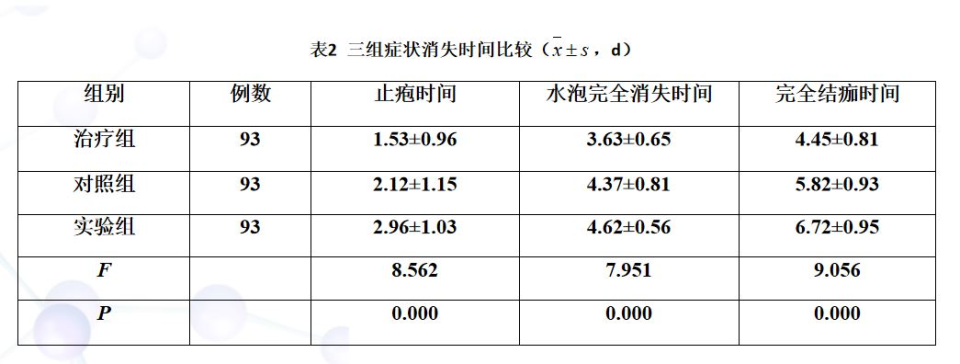 2、症状消失时间:比较三组止泡时间、水泡完全消失时间、完全结痂时间。